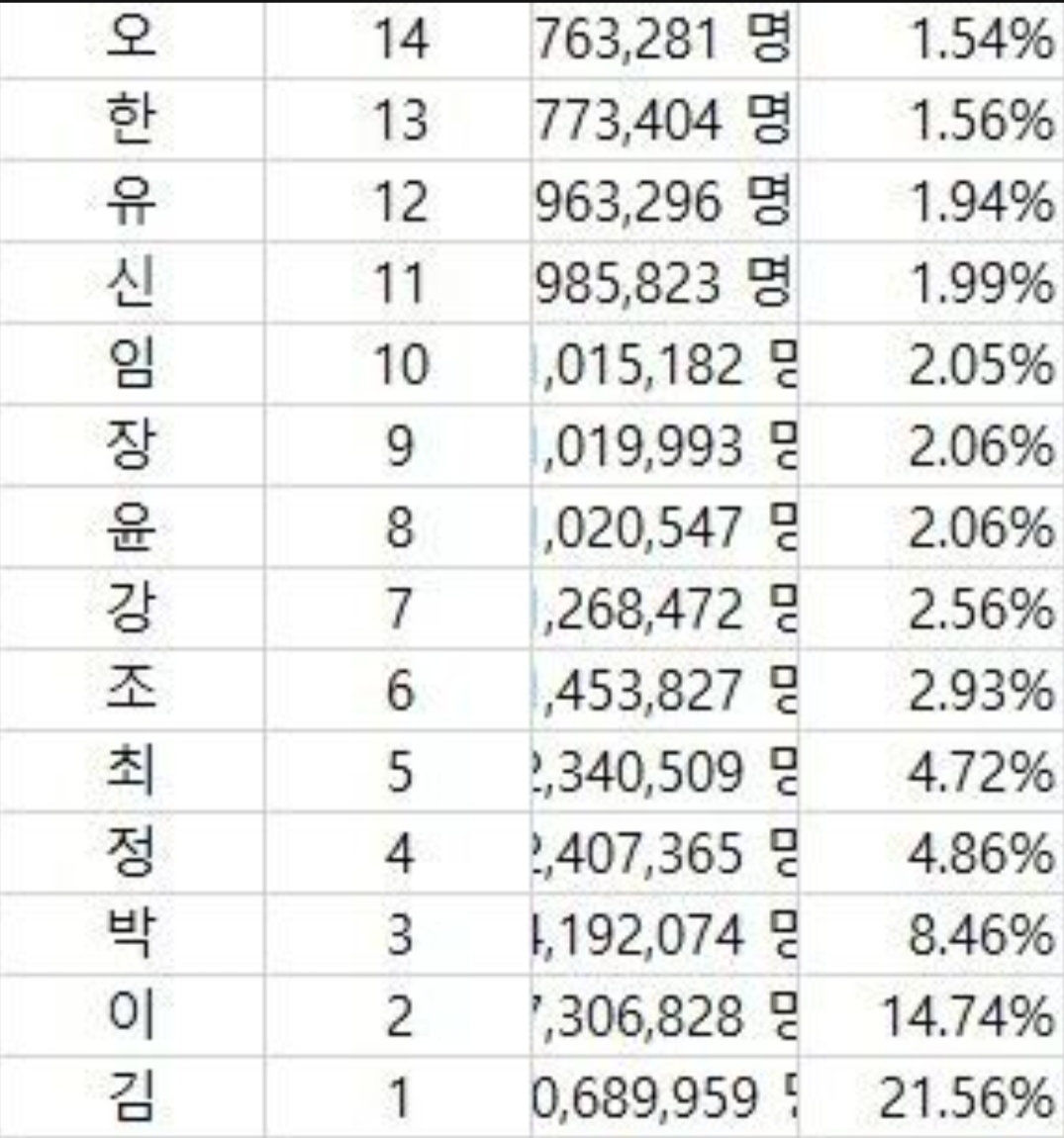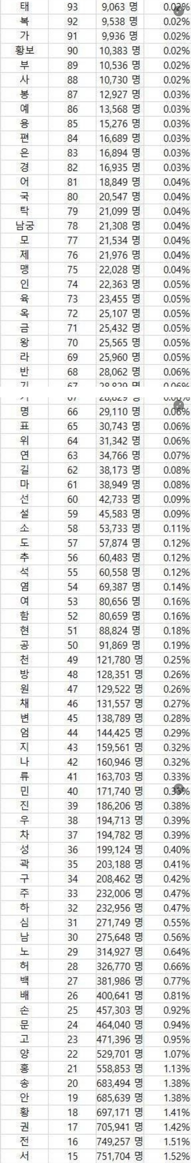 한국에 몇명 없는 성씨 희소 순위 레전드